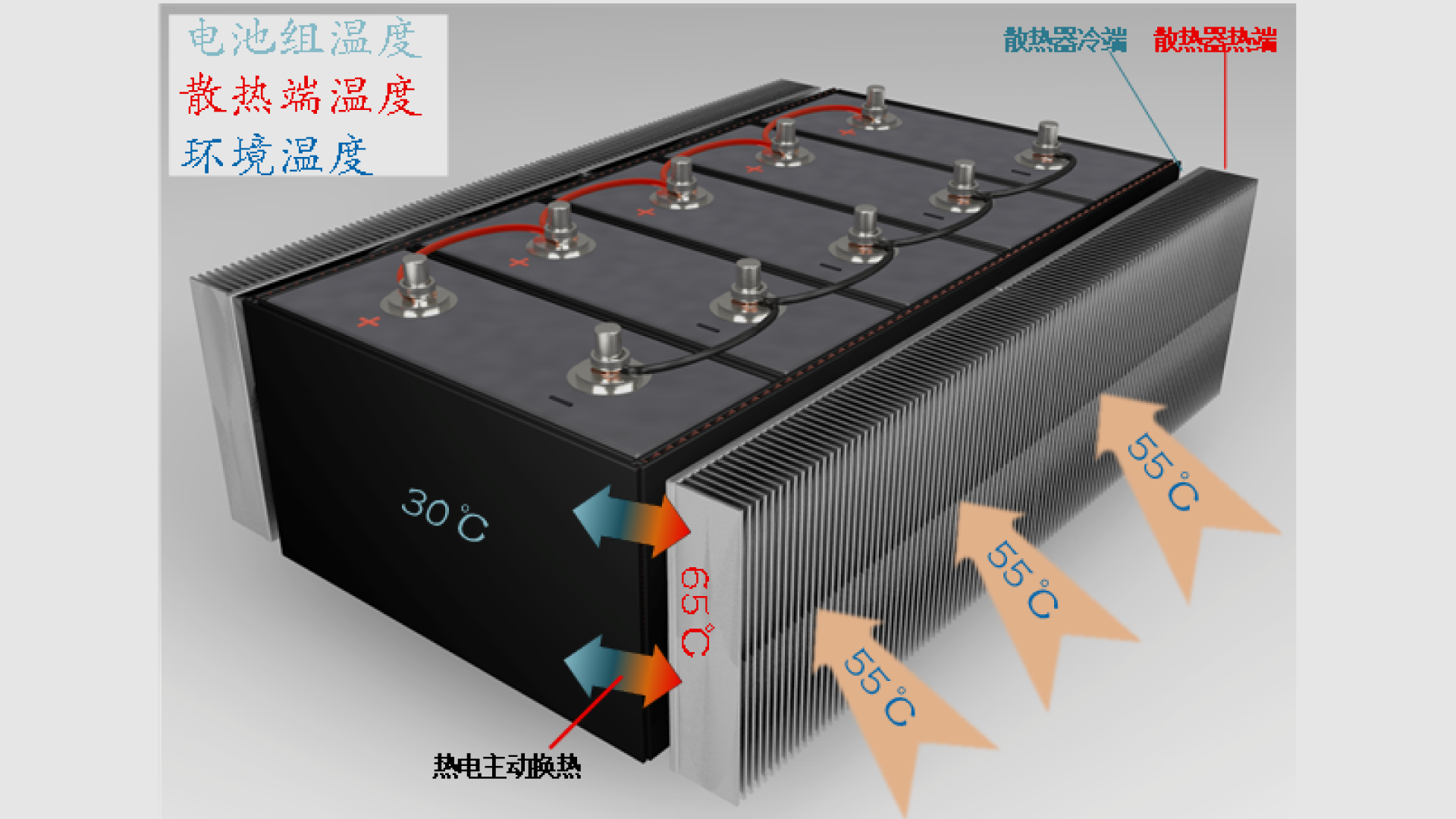 3)采用热电制冷技术,使电池组温度主动可控、制冷/预热可切换,且全域适用。