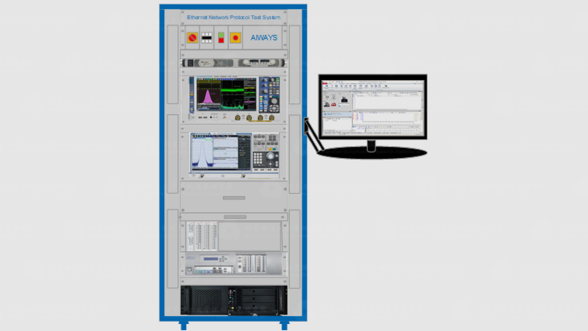 网联测试系统由综测仪测试系统、场景仿真功能测试系统、电源管理模块及工控机等部件组成。