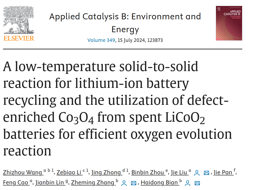 近日,北京理工大学深圳汽车研究院张哲鸣研究员、卞海东副研究员和来自苏州科技大学的刘洁副教授合作,在国际知名期刊Applied Catalysis B: Environment and Energy上发表题为“A low-temperature solid-to-solid reaction for lithium-ion battery recycling and the utilization of defect-enriched Co3O4from spent LiCoO2 batteries for efficient oxygen evolution reaction”的观点文章。