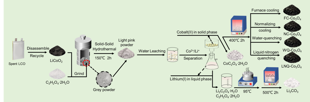 在低温固相反应中,将废旧钴酸锂正极粉末与二水草酸粉末混合,置于反应釜中,加热(>80 ℃)反应后,钴酸锂被转化为水溶性的锂盐和水不溶性草酸钴盐,水浸后,锂盐溶解到水中,草酸钴以固相形式残留在溶液中,过滤后可以实现Co和Li的高效分离。含锂溶液经过简单除杂,蒸发结晶和煅烧之后制备得到纯度较高的碳酸锂;草酸钴经过热处理,控制其在不同介质(炉、空气、水、液氮)中的冷却,制备得到富含缺陷的Co3O4材料,其具体反应流程见图1。
