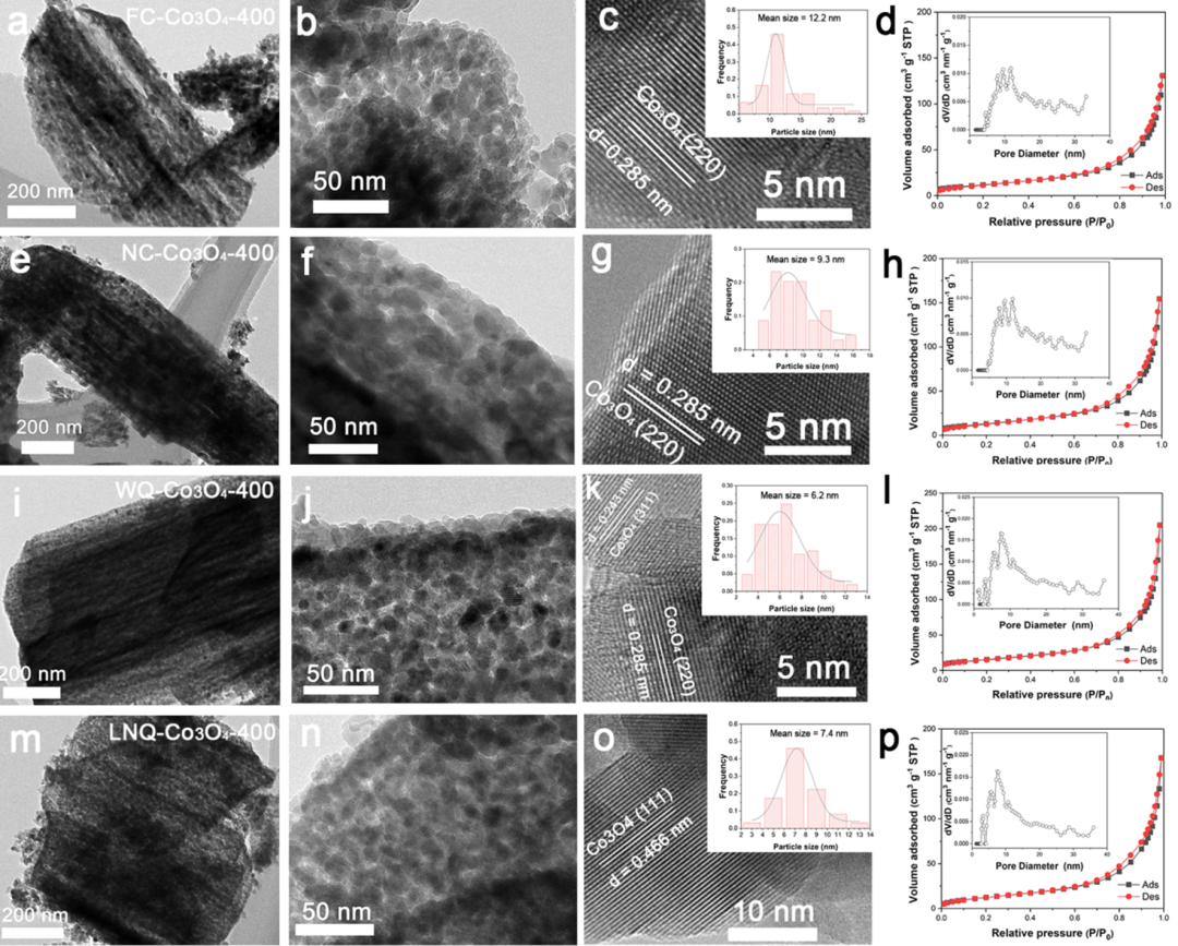图2. 不同冷却速度下制备得到Co3O4催化剂材料的TEM、HRTEM和BET测试