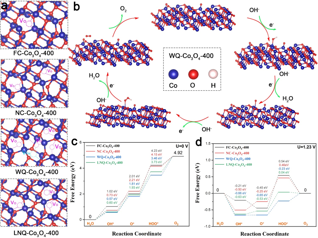 DFT理论计算表明氧空位 (VO)和钴空位 (VCo) 缺陷同时存在的Co3O4材料可以显著降低OER四电子过程中反应中间体的能垒,最终实现高效的OER催化活性。